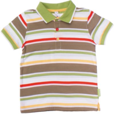 Мягкая футболка-поло в полоску. Воротник застегивается на три цветные пуговки. Рукава на резинке. Состав: 100% хлопок