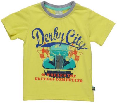Ярко-желтая футболка из хлопковой ткани для мальчика. Декорирована ярким принтом в виде машины, горловина выполнена из контрастной серой ткани.Состав:95%хлопок 5%эластан