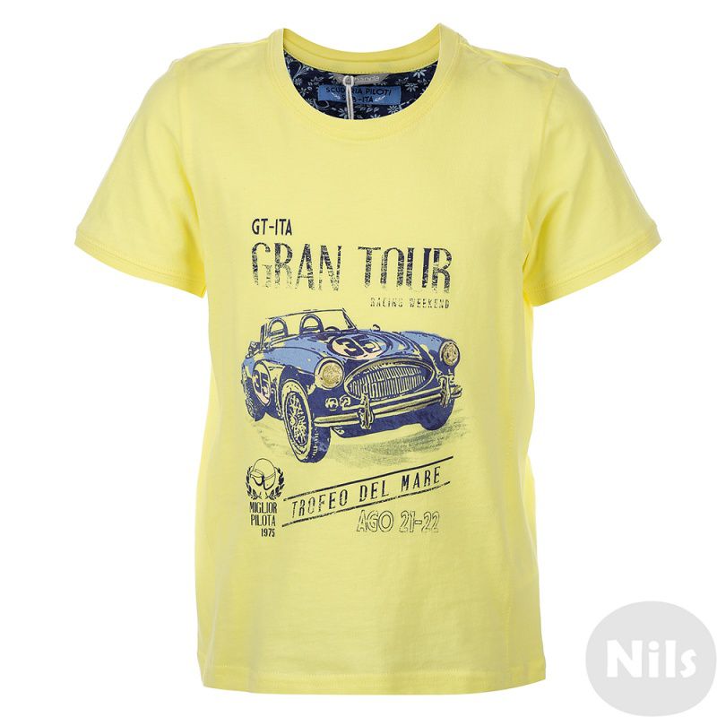 Футболка желтого цвета марки SARABANDA для мальчиков.Футболка с коротким рукавом выполнена из хлопкового трикотажа и украшена принтом синего цвета с автомобилем.