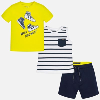 Характеристики товара:• цвет: жёлтый/белый/синий• состав: 100% хлопок• комплектация: футболка, майка, шорты• футболка декорирована принтом• короткие рукава• шорты однотонные• в поясе шнурок• страна бренда: ИспанияКрасивый качественный комплект для мальчика поможет разнообразить гардероб ребенка и удобно одеться в теплую погоду. Он отлично сочетается с другими предметами. Универсальный цвет позволяет подобрать к вещам верхнюю одежду практически любой расцветки. Интересная отделка модели делает её нарядной и оригинальной. В составе материала - только натуральный хлопок, гипоаллергенный, приятный на ощупь, дышащий.Одежда, обувь и аксессуары от испанского бренда Mayoral полюбились детям и взрослым по всему миру. Модели этой марки - стильные и удобные. Для их производства используются только безопасные, качественные материалы и фурнитура. Порадуйте ребенка модными и красивыми вещами от Mayoral! Комплект для мальчика от испанского бренда Mayoral (Майорал) можно купить в нашем интернет-магазине.