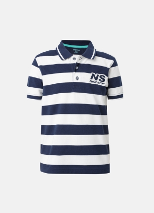 Поло в полоску для мальчиков: - воротник поло - крупная горизонтальная полоска - короткие рукава с манжетами - вышивка на груди