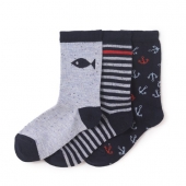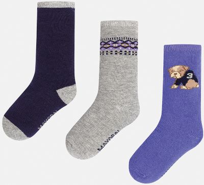 Набор из 3 пар носков для мальчиков от известного испанского бренда Mayoral. В комплекте носки разной расцветки: темно-синий с серыми пяткой, носком и резинкой, серый с фиолетово-черным узором сверху, фиолетовый с рисунком "собачка". Носки сделаны из специальных дышащих материалов, чтобы ноги ребенка не потели.Дополнительная информация:-разная расцветка-состав: 77% хлопок, 20% полиамид, 3% эластанКомплект носков Mayoral можно приобрести в нашем интернет-магазине.