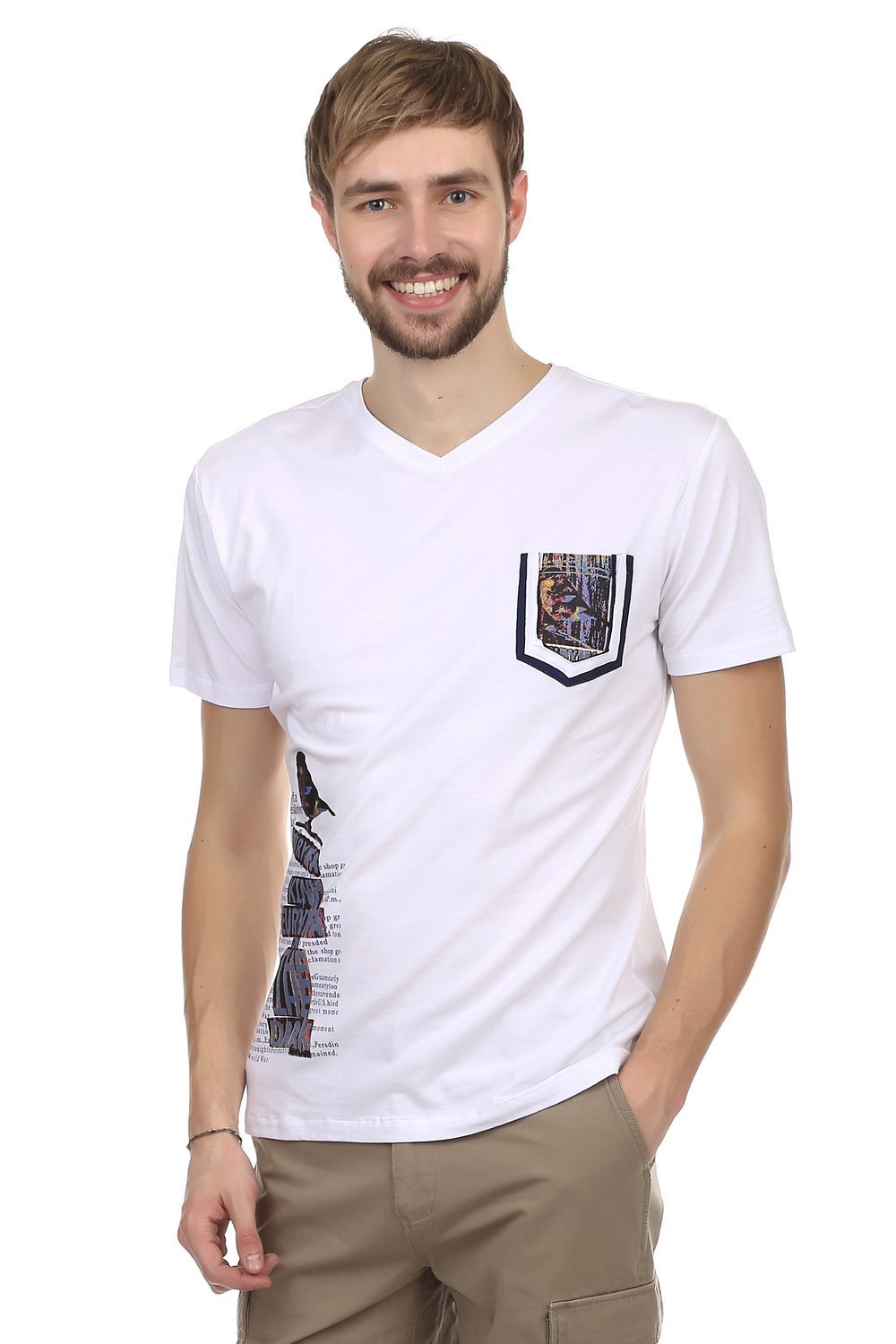 Модная мужская футболка от бренда Just Valeri. Футболка прилегающего кроя выполнена в белом цвете. Изделие дополнено: v-образным вырезом, одним накладным карманом и короткими рукавами. На футболке напечатан неординарный принт на спине, на кармане, а также на боку. Эта модная вещь способна вписаться и сделать стильным любой образ. Она очень удобная и практична, благодаря сочетанию состава ткани, из которого пошита.