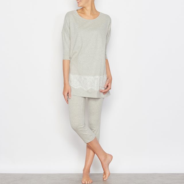 Футболка с рукавами 3/4 с кружевной вставкой внизу . Широкий покрой, круглый вырез . Длина 80 см. Брюки укороченные. Длина по внутр.шву ок.55 см. Пижама 88% хлопка, 7% полиэстера, 5% эластана .