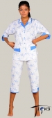 Отправляется по предоплате. Стоимость доставки от 300 рублей. Женская пижама из трикотажного полотна 100% хб. Трикотажная пижама - лёгкий, удобный и комфортный вариант одежды для сна. Пижама из хлопкового трикотажа гипоаллергенная, качественная, натуральная.Женская пижама из легкого трикотажа с бриджами - отличный вариант для любого сезона, в неё не холодно зимой и не жарко летом.Женская трикотажная пижама с бриджами.Блуза прямого силуэта, с круглым вырезом горловины.Спереди, над грудью — рюши.Рукава укороченные, покроя — реглан.Низ блузы и низ рукавов — фигурный.Отделка блузы — контрастные обтачки по горловине, низу блузы и рукавов, контрастные декоративные отстрочки швов, отделочные цветочки — из атласной отделочной ленты. Длина блузы 64 см. Бриджи прямые.Низ бридж с декоративной контрастной отстрочкой.Верх бридж на резинке.Длина бридж 78 см.Рекомендации по уходу за изделиями из трикотажа 100% хб: стирать в машинке при температуре 30-40 градусов со средствами для стирки цветного белья. При более высокой температуре трикотаж 100% хб может дать усадку; изделия из трикотажного полотна с начесом не рекомендуется стирать при температуре выше 30 градусов, они наиболее подвержены усадке; не тереть и не выкручивать; если изделие во время стирки деформировалось, его можно восстановить во время глажки - гладить по направлению петель, хлопчатобумажный трикотаж легко тянется под утюгом в любом направлении.НЕ СТИРАТЬ трикотаж 100% хб вручную и/или с использованием хозяйственного мыла! . Состав: 100% хб.