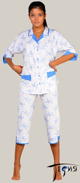 Отправляется по предоплате. Стоимость доставки от 300 рублей. Женская пижама из трикотажного полотна 100% хб. Трикотажная пижама - лёгкий, удобный и комфортный вариант одежды для сна. Пижама из хлопкового трикотажа гипоаллергенная, качественная, натуральная.Женская пижама из легкого трикотажа с бриджами - отличный вариант для любого сезона, в неё не холодно зимой и не жарко летом.Блуза прямого силуэта, с застежкой на пуговицы.Воротник отложной, с лацканами, с контрастной отделкой.Спереди - накладные карманы, с контрастной отделкой.Рукава - рубашечные, разрезные.Низ рукавов с оригинальными манжетами с отделочными уголками и контрастной отделкой. Длина блузы 64 см.Бриджи прямые, с оригинальными манжетами, с отложными уголками и контрастной отделкой.Верх бридж на резинке.Длина бридж 78 см.Контрастная отстрочка швов и деталей.Рекомендации по уходу за изделиями из трикотажа 100% хб: стирать в машинке при температуре 30-40 градусов со средствами для стирки цветного белья. При более высокой температуре трикотаж 100% хб может дать усадку; изделия из трикотажного полотна с начесом не рекомендуется стирать при температуре выше 30 градусов, они наиболее подвержены усадке; не тереть и не выкручивать; если изделие во время стирки деформировалось, его можно восстановить во время глажки - гладить по направлению петель, хлопчатобумажный трикотаж легко тянется под утюгом в любом направлении.НЕ СТИРАТЬ трикотаж 100% хб вручную и/или с использованием хозяйственного мыла! . Состав: 100% хб.