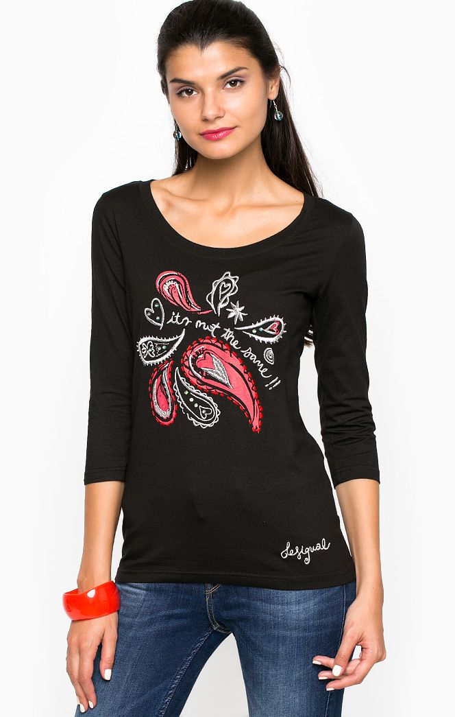 Футболка Desigual- происхождение бренда: Испания- производство: Индия- материал: 95% хлопок, 5% эластан- декоративная отделка: принт, вышивка, стразы- цвет: черный/красный/серебристый/розовый- рекомендации по уходу: стирать вручную, не гладить