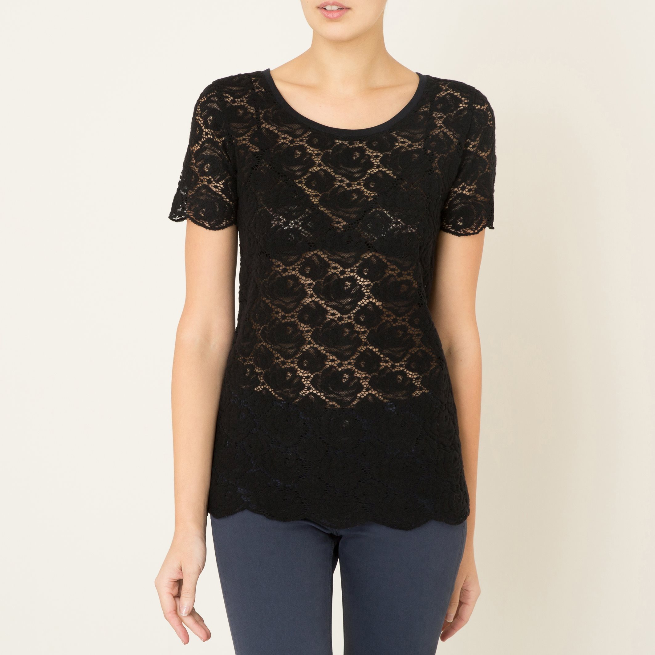 Футболка MAJESTIC FILATURES - из ажурного хлопкового кружева, кашемира, шелка и однотонного трикотажа сзади . Круглый вырез в рубчик . Прямые короткие рукава. Однотонная спинка. Состав & Детали Материал : 70% хлопка, 15% кашемира, 15% шелка Спинка 80% шерсти, 20% хлопка Подкладка 100% хлопкаМарка : MAJESTIC FILATURES