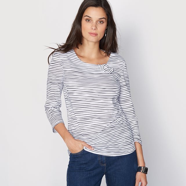 Футболка с рисунком в оригинальную полоску спереди и сзади. Оригинальный вырез с маленьким бантиком. Рукава 3/4. Футболка из хлопка и модала, откройте для себя натуральный хлопок и мягкий и нежный модал. Состав и описание :Материал : Джерси, 50% хлопка, 50% модала.Длина 62 см.Марка : Anne WeyburnУход :Машинная стирка при 30 °C в умеренном режиме .Гладить при средней температуре .