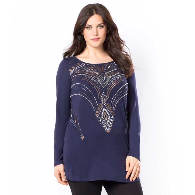 Футболка. Крупная вышивка с графичным узором, украшенная бусинами и выполненная в стиле арт деко. Очень женственный вырез-"лодочка" и длинные рукава. 47% хлопка, 47% модала, 6% эластана. Длина 72 см.
