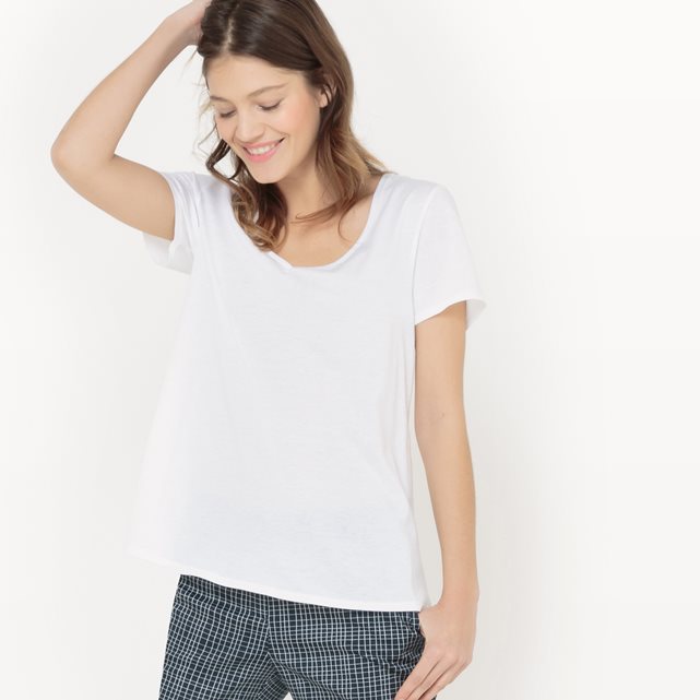 Материал : 50% хлопка, 50% модала Длина рукава : короткие рукава Форма воротника : V-образный вырез Покрой : стандартный Рисунок : однотонная модель Стирка : машинная стирка при 30 °С в деликатном режиме Уход : сухая чистка и отбеливание запрещены Машинная сушка : машинная сушка запрещена Глажка : при низкой температуре