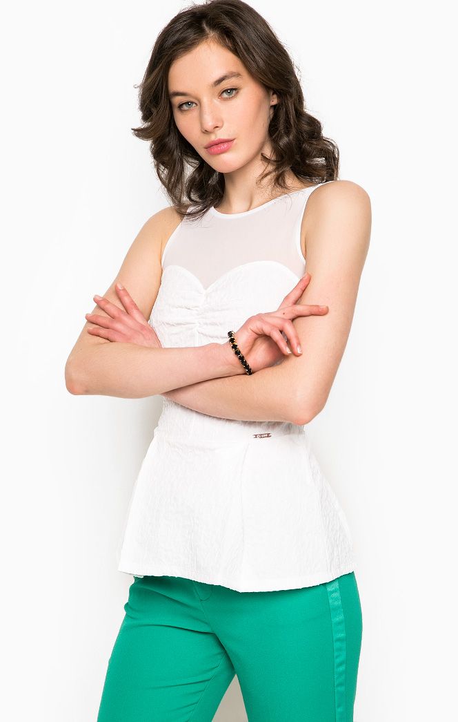 Топ Guess- происхождение бренда: США- производство: Болгария- материал: 98% полиэстер, 2% эластан- цвет: белый- рекомендации по уходу: стирать вручную, гладить при 110°, сушить в подвешенном состоянии