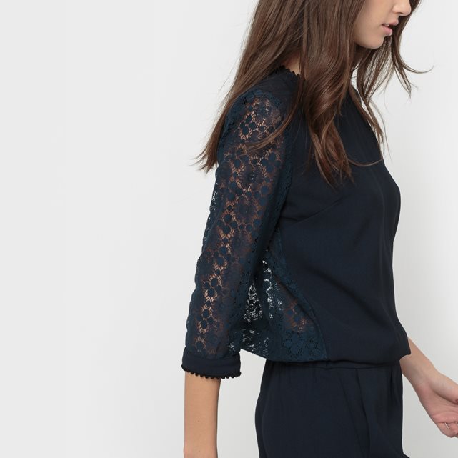 Комбинезон-шорты из двух материалов . Рукава и спинка из кружева. Рукава ¾. Круглый вырез. Сзади разрез на пуговице. Защипы ниже пояса спереди. 2 боковых кармана на шортах . Вырез и низ рукавов в зубчик. Состав и описание Материал : креп из 100% полиэстера.Кружево : 80% хлопок, 20% полиамид.Длина по внутр.шву : 10 смМарка : Mademoiselle R. УходМашинная стирка при 30°C на деликатном режиме Стирать с вещами подобного цветаГладить на очень низкой температуре