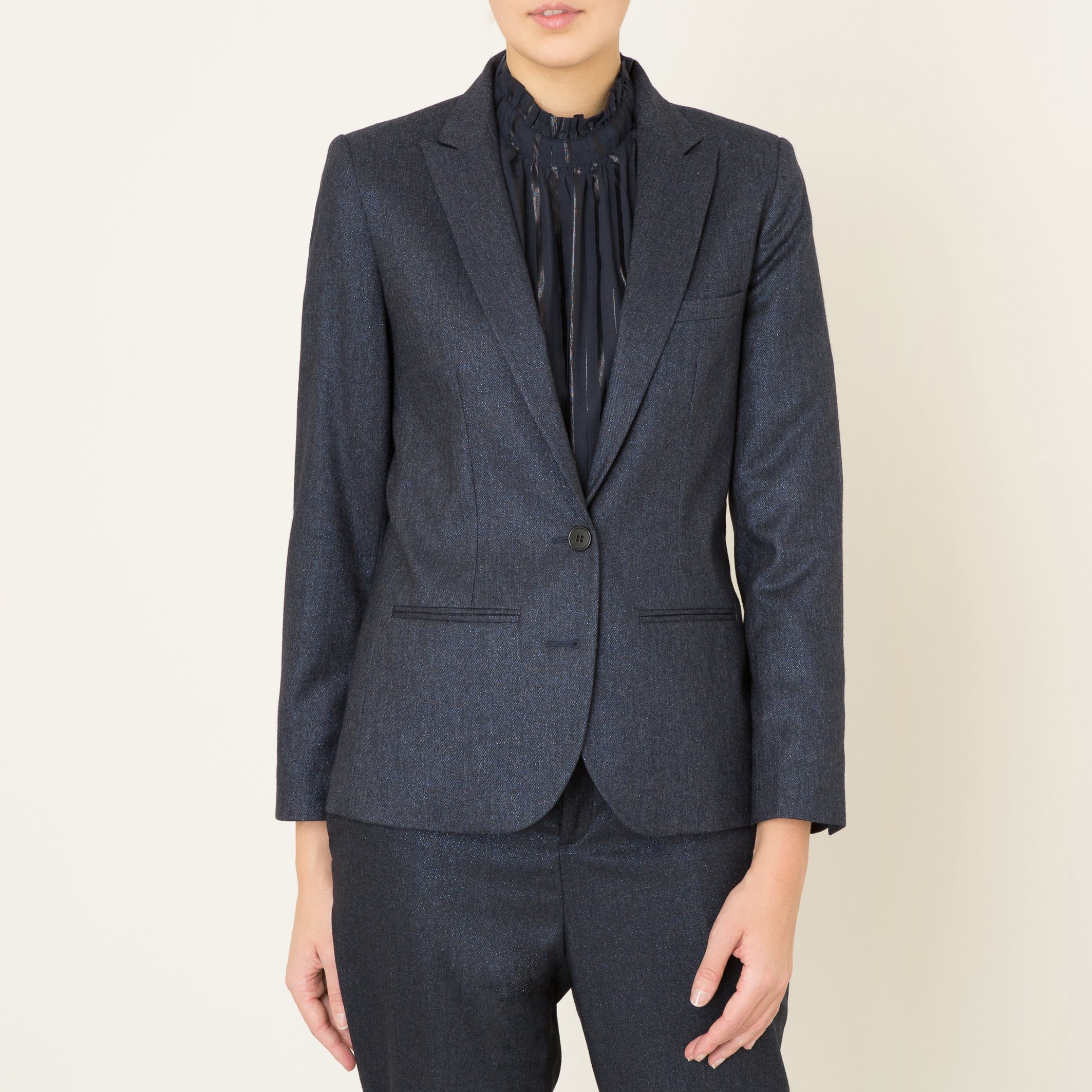 Жакет SOEUR - модель ARLETTE из шерсти с пропиткой . Пиджачный воротник в зубчик . Застежка на 2 пуговицы. 1 нагрудный карман и 2 прорезных кармана снизу . Манжеты на 3 пуговицах . Шлица сзади. Блестящее покрытие . Состав и описание Материал : 38% шерсти, 32% полиэстера, 27% вискозы, 3% полиамида Подкладка в области корпуса : 57% хлопка, 43% ацетата Подкладка рукавов : 55% ацетата, 45% вискозы Длина : до середины спинки ок. 64 см. (для размера S) Марка : SOEUR