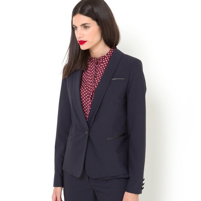 Жакет-блейзер, КАЧЕСТВО BEST, из материала стретч: 53% полиэстера, 43% шерсти, 4% эластана. Приталенный покрой, вытачки и вертикальные швы. 2 ложных прорезных кармана + 1 нагрудный карман. 1 внутренний прорезной карман на пуговице. Застежка на металлическую пуговицу. Шлицы на манжетах с пуговицами. Жаккардовая подкладка: 100% полиэстера. Отделка карманов синтетической кожей (100% полиуретана). Длина ок.65 см. Данный товар отмечен знаком качества BEST. Элегантность материалов и изящность отделки и покроя выгодно отличают этот жакет высокого качества.