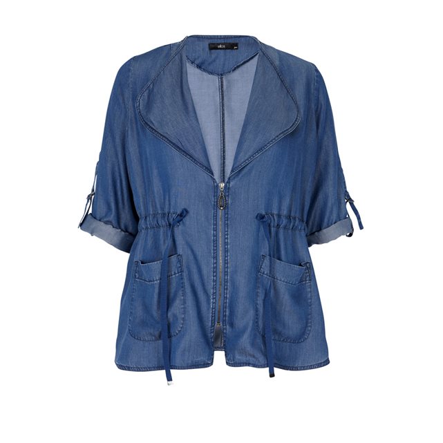 Жакет из денима, выполненного из мягкого 100% лиоцелла. Модель комфортного свободного покроя с широкими отворотами на вырезе и завязками на кулиске на талии. Закругленный низ с разрезами по бокам. Длина ок.78 см. для размера 42/44. 100% лиоцелла.Покрой: свободный.Стирка при 40°.Обратите внимание, на нашем сайте размеры шведского бренда ELLOS (Элос) приведены к французским стандартам: т.е. на сайте и на упаковке товара указан французский размер, но на вшитом ярлыке товара будет указан размер производителя. Заказывайте ваш обычный французский размер.