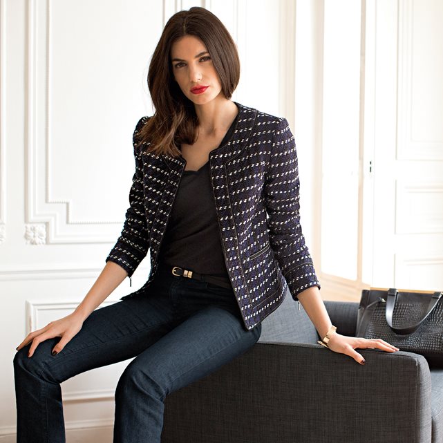 Жакет из твида, 70% акрила, 20% шерсти, 10% полиэстера. Жаккардовая подкладка, 100% полиэстера. Круглый вырез. Бортовка снизу, на манжетах на молнии и на ложных карманах. Застежка на крючки. Отделка оригинально украшенной тесьмой. Длина 56 см.