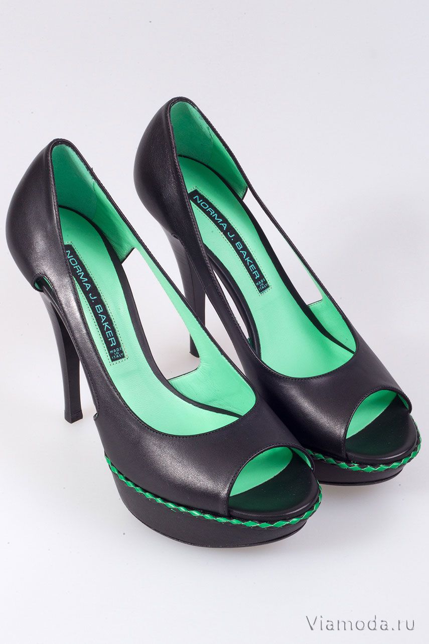 Посадка: размер в размер; Высота каблука: 12 см Высота платформы: 3 см. Модные босоножки Norma J. Baker из черной кожи. На фоне основного цвета изделия контрастирует внутренняя отделка яркого зеленого цвета. Закругленная спереди платформа разграничена с верхом босоножек зеленой линией плетеного шнура.