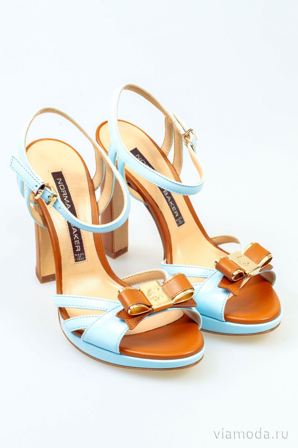 Посадка: размер в размер; Итальянские женские босоножки Norma J. Baker/ Норма Джей Бэйкер на устойчивом каблуке. Коллекция весна-лето 2014 года. Босоножки полностью выполнены из 100% натуральной кожи. Пятка и носок удерживаются ремешками, застегиваются вокруг лодыжки на ремешок с пряжкой. В области носка декорированы небольшими бантиками с позолоченными элементами из металла с логотипом бренда. Носок и пятка открытые.Основной цвет голубой, каблук, бантики и элементы внутренней отделки светло-коричневые.Высота каблука: 11 см, высота платформы: 1 см