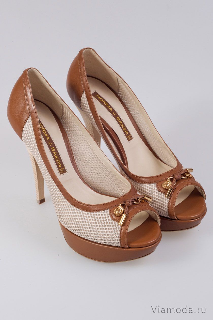 Посадка: размер в размер; Высота каблука: 8 см Высота платформы: 0,5 см. Босоножки Norma J. Baker из натуральной кожи на шпильке с платформой. Основная часть сделана из светло-бежевой перфорированной кожи с тканевой подкладкой. Задник и окантовка из коричневой кожи. Передняя часть украшена металлической фурнитурой со шнурком, завязанным в узел.